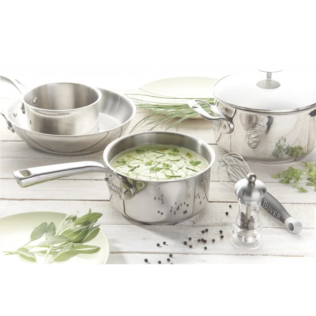 Le savoir-faire et l’excellence Ă la française s’invitent chez vous avec la Batterie Cuisine Inox Milady De Buyer. Celle-ci se compose de 3 casseroles dont le diamĂštre extĂ©rieur est de 16, 18 et 20 cm.Â