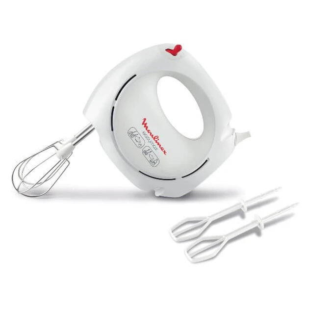Blancs en neige, brioche, et tout autres types de préparations seront mélangés à la perfection. Vous pouvez augmenter la vitesse du batteur à votre guise et les éjecter tout aussi facilement afin de les échanger ou les nettoyer. De plus, le batteur électrique Moulinex est design et arbore de belles couleurs blanches et rouges.