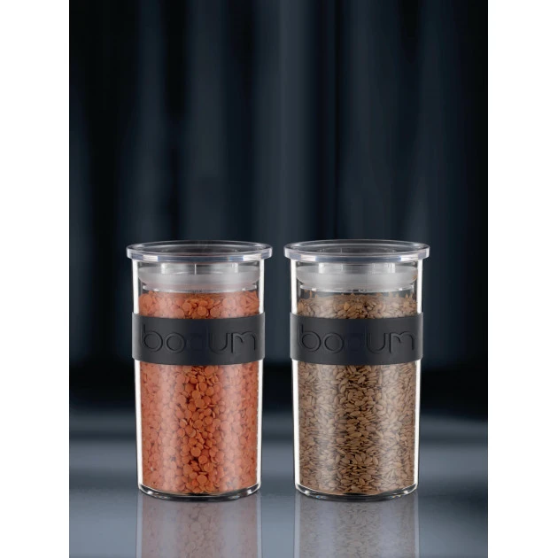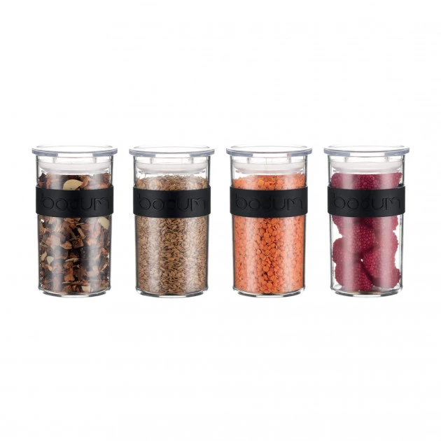 IdĂ©al pour les produits secs (farine, sucre, pâtes) comme pour les produits liquides, qu’ils soient chauds ou acides. Pouvant aller au lave-vaisselle le Bocal PRESSO Bodum 250 ml est transparent avec une bande noire qui rendra ce Bocal Plastique Alimentaire.Â
