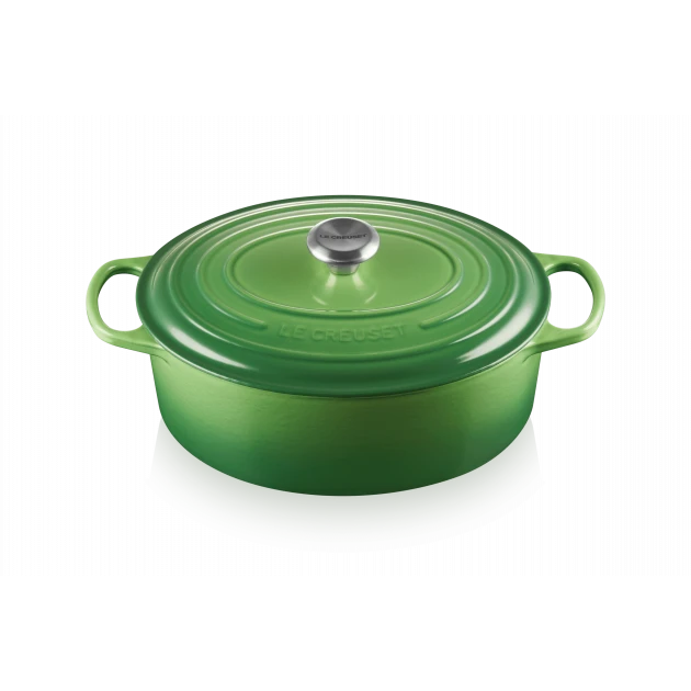 Vous connaissez la cocotte ronde traditionnelle, optez maintenant pour la Cocotte en Fonte Ovale 31 cm Bamboo Le Creuset Signature.