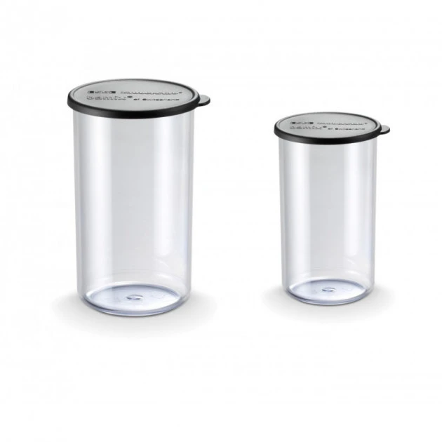 Le coffret mixeur plongeant Bamix inclus Ă©galement 3 gobelets de 400 ml, 600 ml et 1000 ml. Chacun est muni d’un couvercle, ainsi vous pourrez confectionner votre recette et la conserver au frais si nĂ©cessaire, sans risque qu’elle se renverse ou s’imprègne des odeurs des autres aliments.Â