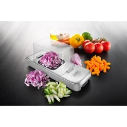 Le coupe lĂ©gumes Alligator avec bac et  ses 3 grilles en inox pour dĂ©couper, hacher et trancher vos lĂ©gumes et fruits. Pour vous aider Ă prĂ©parer vos mets en toute sĂ©curitĂ© et d’un seul geste rapide en abaissant le levier.