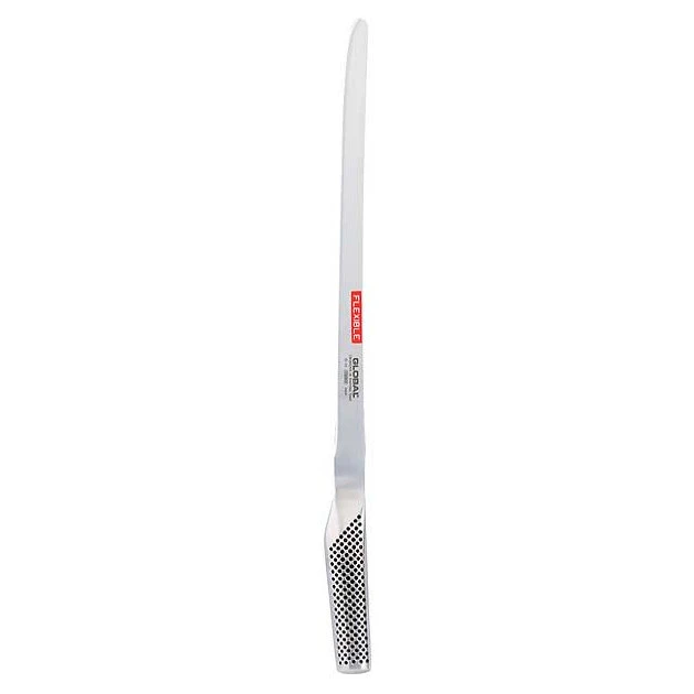 La lame du couteau Global G10 est flexible unie, idéale pour la décooupe des jambons et saumons.