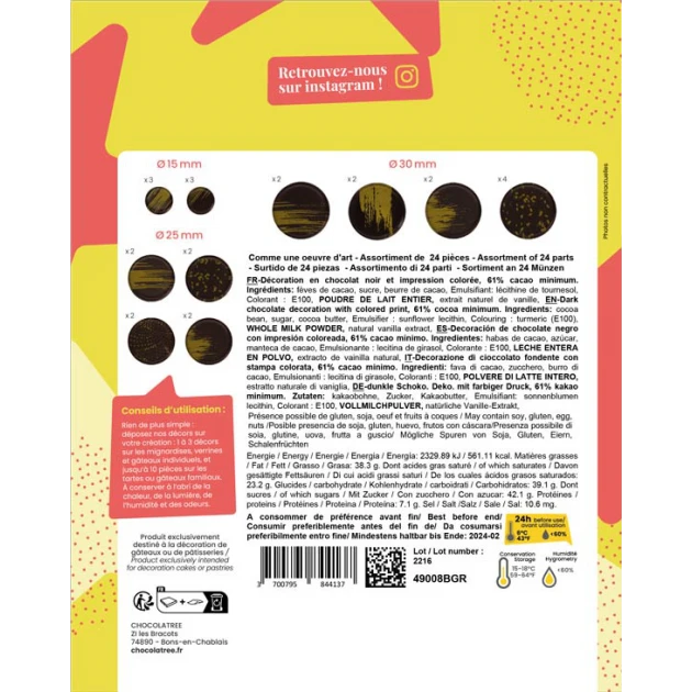 Ces décorations en chocolat se caractérisent par 24 pièces de différents diamètres allant de 1,5 à 3 cm de la célèbre marque Valrhona. Le gout intense du chocolat noir, le croquant des pièces en chocolat ainsi que les motifs dorés seront parfaits en guise de décors noël.