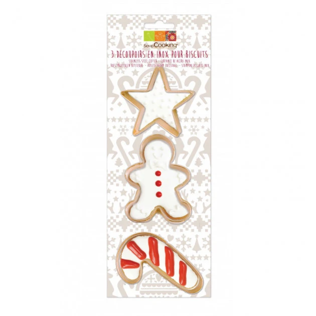 Dans ce lot vous trouverez 3 emporte-pièces Noël de formes différentes : un découpoir étoile, un découpoir gingerman et un découpoir sucre d’orge. Une simple pression sur votre pâte sablée et vous obtenez de bons petits biscuits que vous pourrez ensuite décorer avec stylo de glaçage blanc ou rouge.