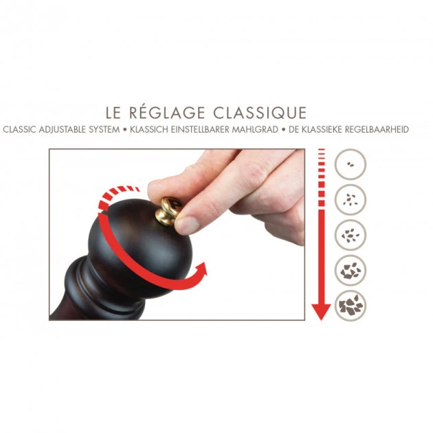 Le moulin Ă poivre et le moulin Ă sel Peugeot sont coiffĂ©s d’un bouton en acier brossĂ© qui permet de rĂ©gler la mouture. Plus le bouton est serrĂ©, plus la mouture est fine, et inversement.Â