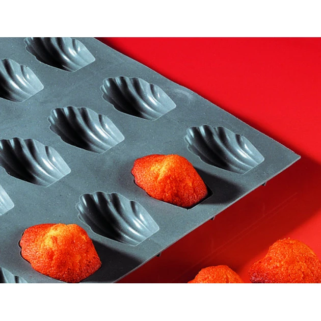 Moule à Madeleine en Elastomoule : Mousse de silicone alimentaire. La matière de l’Elastomoule transmet parfaitement la chaleur et donne un bel aspect doré sur le dessus comme sur le dessous aux madeleines et leur confère un goût inimitable grâce à la caramélisation des sucs qui se produit lors de la cuisson.