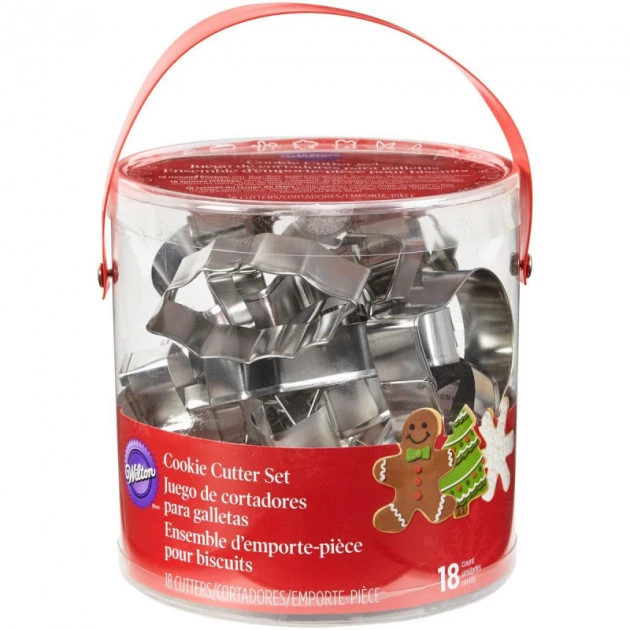 - Lot de 18 emporte pièce : flocon de neige, feuille de houx, fille en pain d’épice, étoile, traîneau, arbre de Noël, chaussette, bonhomme de neige, renne, ornement, bâton de sucre d’orge, bonnet de Père Noël, ange, cloche, cadeau, couronne, garçon en pain d’épice, et gant