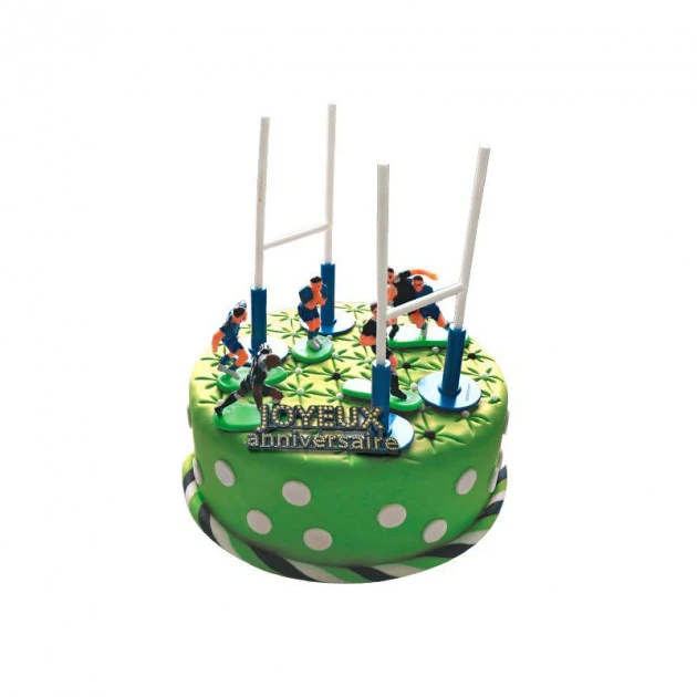 Accro du ballon ovale ? Une décoration de gâteau d’anniversaire aux allures de terrain de rugby devrait donc vous plaire ! Dans ce Kit Décor Gâteau de 8 pièces, toutes aptes au contact avec des aliments, vous trouverez de quoi créer un vrai terrain de rugby sur votre dessert ! En effet, se kit de décoration de gâteau comprend 6 joueurs (sur 5 socles), soit 3 joueurs par équipe, ainsi qu’un lot de 2 poteaux de but. Et pour rappeler la fête, un décor « Joyeux anniversaire » est également présent parmi les décorations thème Rugby. En plus d’être original, vous aurez gagné du temps sur la décoration de votre gâteau d’anniversaire.