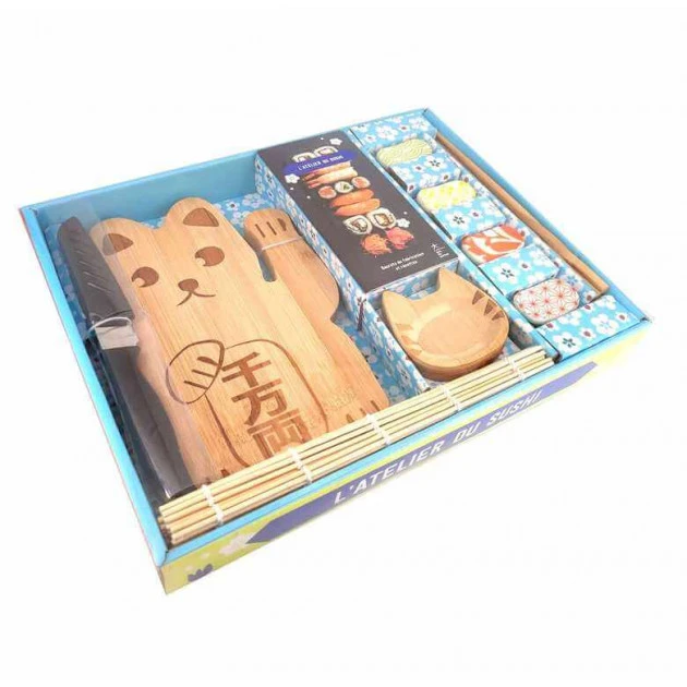 Vous retrouverez dans le coffret L’atelier du sushi un couteau en inox, une planche de service prenant la forme d’un adorable maneki neko, une natte pour rouler les makis, deux coupelles pour sauces en forme de chat, et quatre paires de baguettes et repose-baguettes. Cet ensemble aux couleurs pastelles et aux motifs fleuris sauront dĂ©corer votre table pour accompagner au mieux vos crĂ©ations culinaires. Prenez plaisir Ă confectionner des sushis maison avec le coffret livre de recettes L’atelier du sushi.