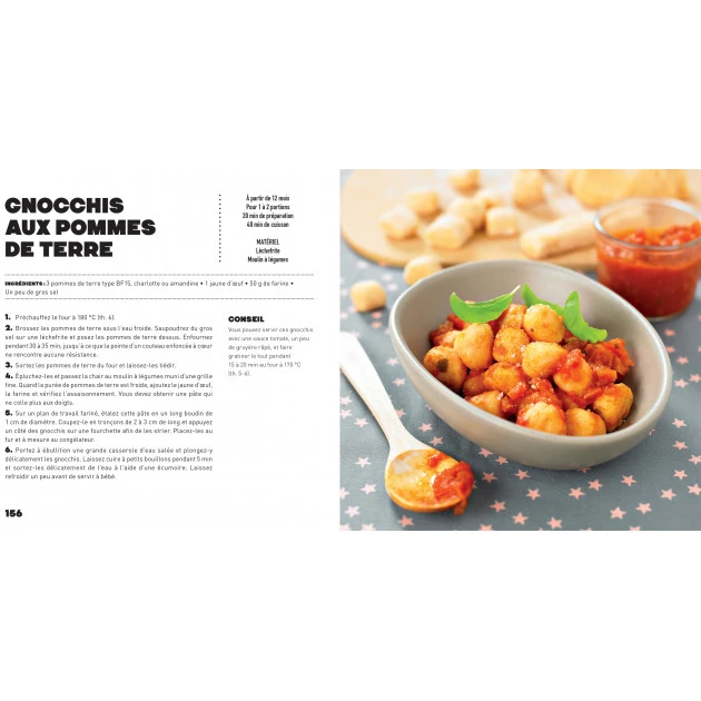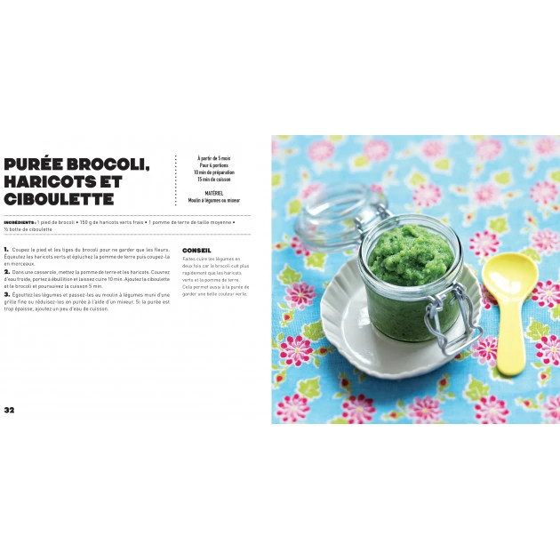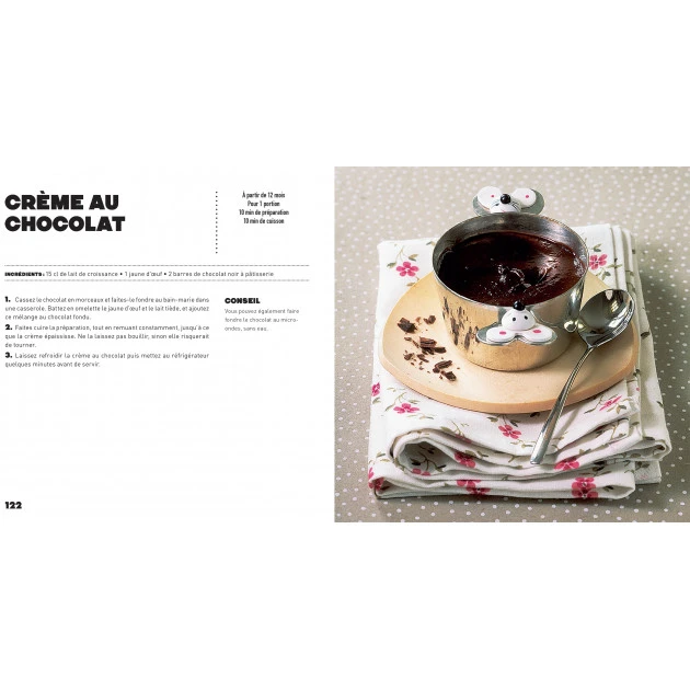 Le livre de cuisine bébé a été spécialement conçu pour s’adapter à l’alimentation d’un enfant de 4 mois à 3 ans. Vous retrouverez ainsi dans le livre cuisine bébé 100 recettes, allant du jus de carottes jusqu’aux boudoirs maison, sans oublier la purée de pomme de terre et endives, et même une recette de croque-monsieur !