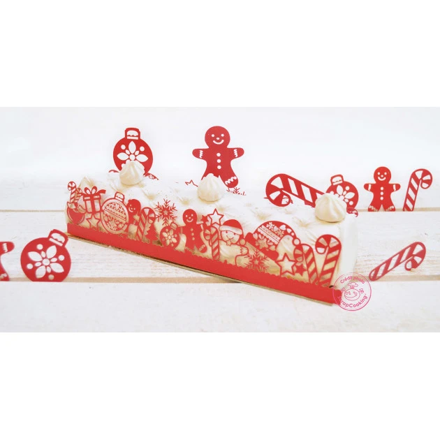 Cette décoration gâteau de Noël est constituée de 2 contours bûche et de 3 cake toppers pour ajouter une touche festive en un clin d’œil. En papier rouge apte au contact alimentaire, les décorations de bûche représentent des bonhommes pain d’épice, des cannes à sucre ou encore des boules de Noël… de quoi se mettre dans l’ambiance !