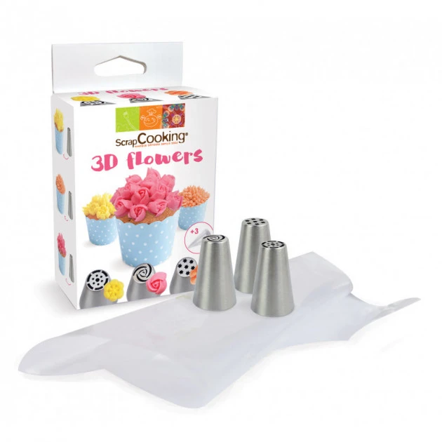 Le Kit douilles inox Fleurs 3D ScrapCooking contient 3 douilles russes fantaisies, avec 3 poches pùtissiÚres. Avec les 3 motifs différents de fleurs, vous pourrez faire des décors de fleurs trÚs facilement. Le rendu sera spectaculaire et fera son petit effet sur vos invités !