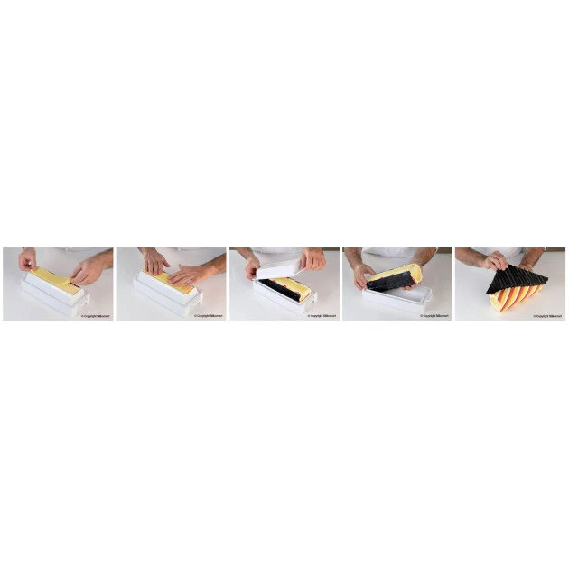 – 1 tapis silicone Ă la texture ondulĂ©e qui combinĂ© avec la plaque de silicone vous permettra de crĂ©er trĂšs facilement des bandes diagonales de couleurs diffĂ©rentes pour recouvrir votre bĂ»cheÂ