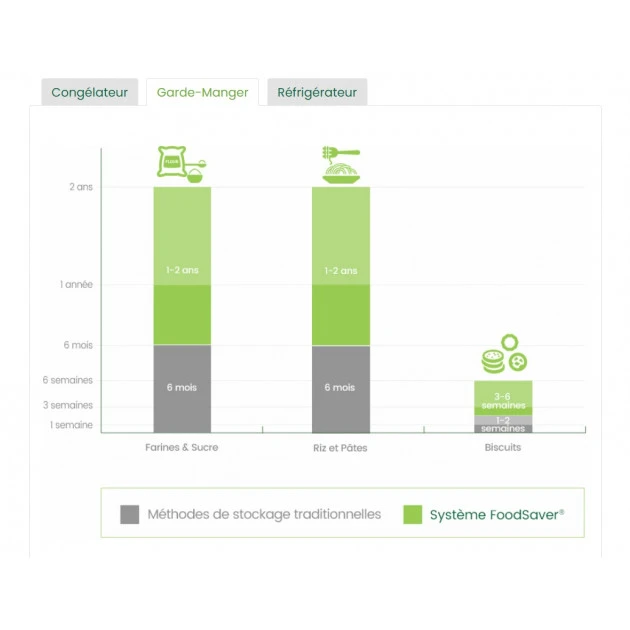 - Nouveau système: conserve 5 fois plus longtemps que les méthodes classiques (sac congélation, papier aluminium, boîte hermétique)