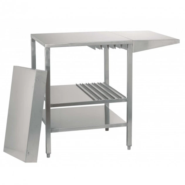 Plan de travail en acier inoxydable équipée de 2 roues pivotantes à frein et 2 pieds à vérin réglables.