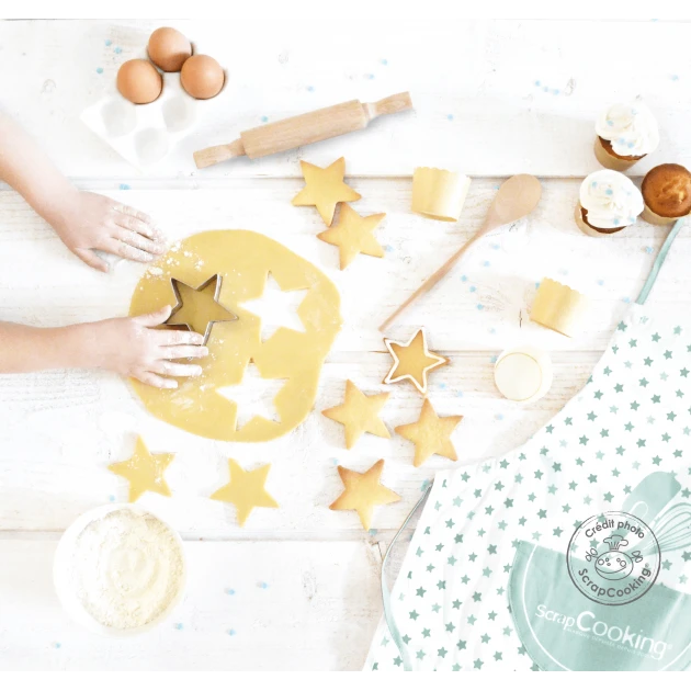 Vous trouverez ainsi à l’intérieur de cette mallette kraft 25 caissettes en papier de 6 cm de diamètre pour réaliser de délicieux cupcakes, ainsi qu’un emporte-pièce étoile en inox pour confectionner biscuits en tout genre. Ce kit pâtisserie enfant dispose également d’une cuillère en bois de 23 cm, d’un rouleau à pâtisserie en bois et d’un tablier en coton sertie d’étoiles couleur vert d’eau très tendance.
