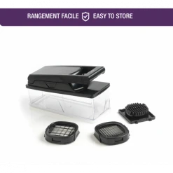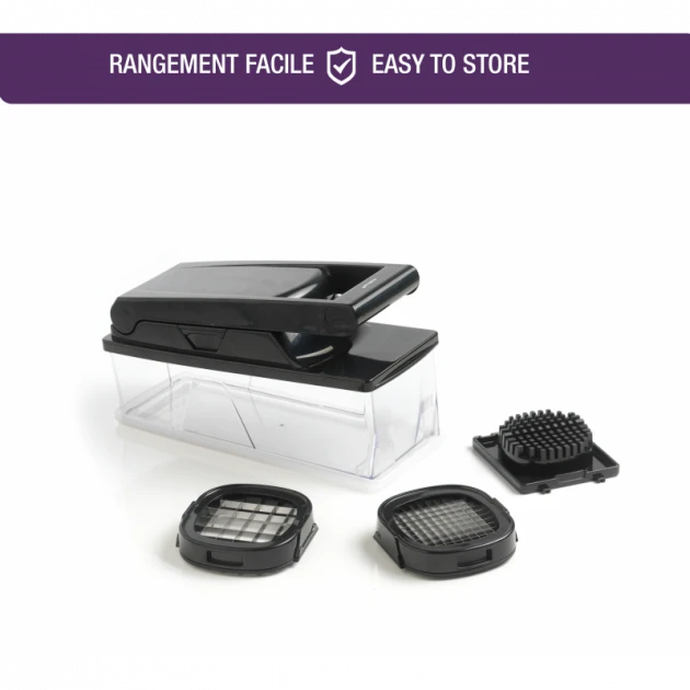 Coupez et tranchez tous les types de légumes ! Réalisez facilement et rapidement 3 tailles de dés et bâtonnets de légumes (pommes de terre, courgettes, carottes, concombres…) avec ce coupe légumes. Son réservoir permet de stocker les légumes découpés et permet à l’appareil d’être utilisé sur des espaces de travail réduits sans salissures. Équipé d’une poignée ergonomique et d’une base antidérapante, le tranche-légume est très facile et sûr à utiliser.