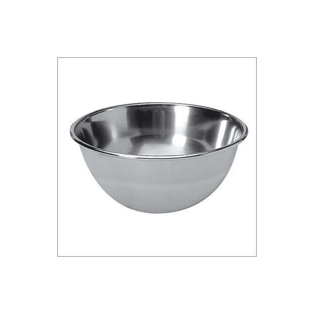 Cul de poule, ou bassine à pùtisserie demi-ronde, en acier inoxydable et fond arrondi avec une petite base plate afin de maintenir le cul de poule à droit sur une surface plane.