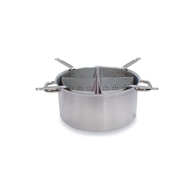 Ensemble constituĂ© d’un faitout inox tous feux Excellence Ă 36 cm et de 4 cuit-pĂątes triangulaires.