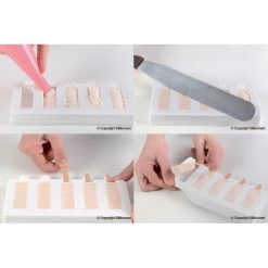 Ce moule à glace silicone souple est vendu par set de 2 Moules de 5 empreintes, avec une plaque support rigide pour faciliter la manipulation et le transport du moule de votre plan de travail au congélateur ou à la cellule de refroidissement. Ce kit à glace comprend 50 mini bâtonnets à planter directement dans l’endroit prévu à cet effet juste avant la surgélation de votre préparation.