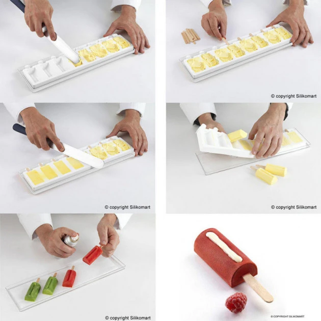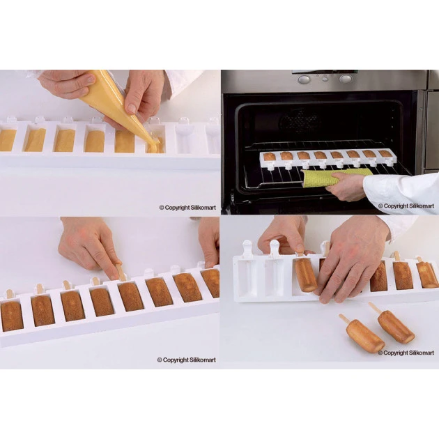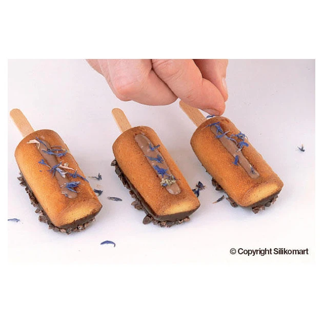 - Pour démouler les bâtonnets, tordez la partie supérieure du moule silicone pour faire sortir la glace ou le gâteau par le haut.