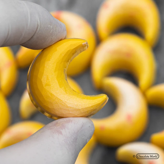 Nul besoin d’un tĂ©lescope pour observer les corps cĂ©leste comme la Lune, un peu de chocolat de couverture suffira. Chocolate World vous fait voyager dans les Ă©toiles avec son moule demie-lune Ă facettes. Tout comme son modèle, la demie-lune reflète la lumière grâce Ă ses nombreuses facettes. Cette rĂ©fraction Ă le don de captiver quiconque l’observe, en particulier les gourmands.