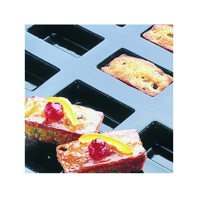 Les 25 empreintes de la plaque de 60 x 40 cm mesurent 8,9 x 4,6 cm pour des mini-cakes qui accompagnent Ă merveille un cafĂ© ou un thĂ© gourmand. Comme le moule est anti adhĂ©sif, il est inutile d’ajouter des matières grasses qui risqueraient de dĂ©naturer le goĂ»t de vos gâteaux.