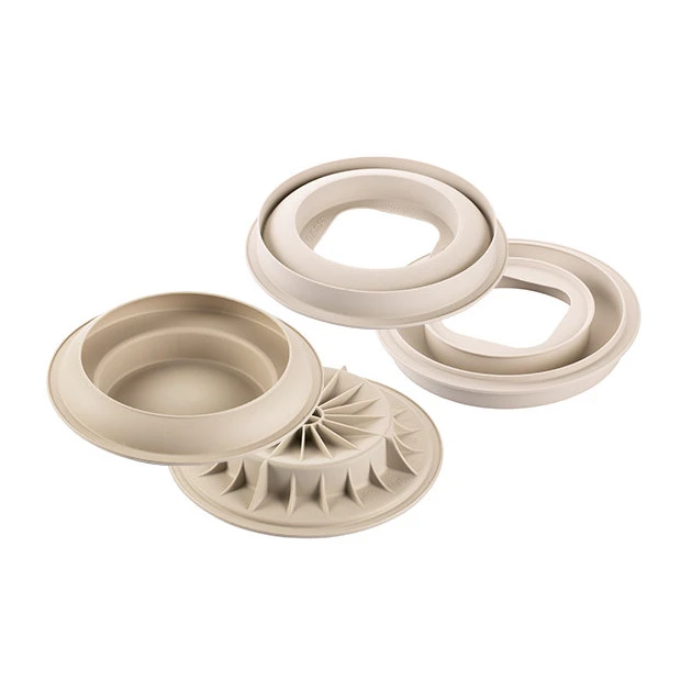 Surprenez vos proches avec un entremets Ă la forme Ă©tonnante. Le design du Moule Silicone IO & TE se divise en une base simple sur laquelle se posera un anneau gourmand. Vous obtiendrez au final un entremets de 1770 ml, soit un dessert de 21 cm de diamĂštre et de 6 cm de haut.Â