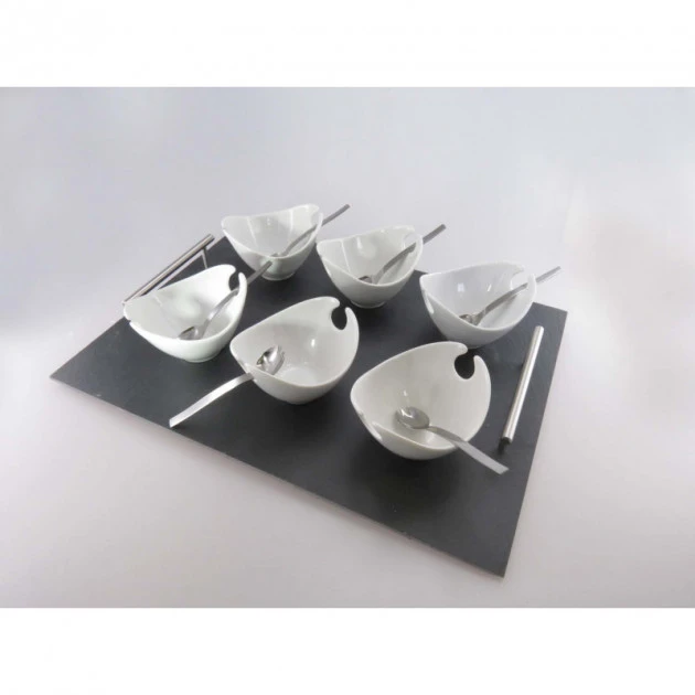 Ce plateau avec ses 6 coupelles Jonque blanches vous est proposé par LeBrun. Le coffret se compose également de ses 6 cuillères mixtes (cuillère et fourchette), présenté sur un plateau en ardoise avec ses poignées métalliques.