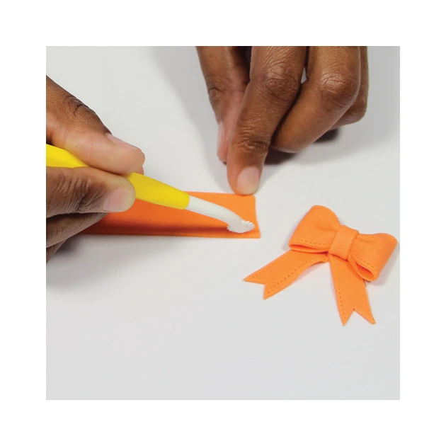 La seconde extrémité de l’ustensile pour pâte à sucre, incurvée et pointue, se révèle indispensable pour créer de fins détails comme les nervures d’une feuille, le sourire d’un personnage ou encore pour assembler deux extrémités de pâte à sucre.