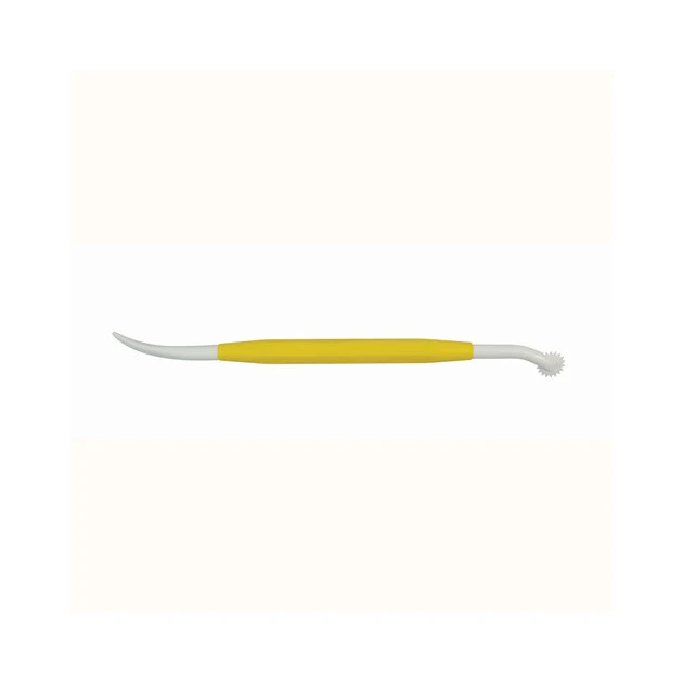 Outil indispensable au Cake Design, l’Ebauchoir Pâte à Sucre permet de réaliser de nombreux décors avec des effets variés. Ce modèle se dote de deux embouts, l’un incurvé et pointu et l’autre doté d’une roulette dentelée amovible. L’ustensile pâte à sucre double embout se montre très pratique car il évite de passer d’un accessoire à l’autre et de perdre du temps. D’une longueur totale d’environ 16 cm, il conviendra à toutes les mains.