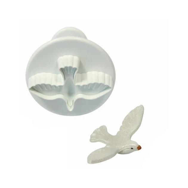 Pour confectionner un bel oiseau, prenez une petite quantitĂ© de pâte Ă sucre, et façonnez une petite bille avec une extrĂ©mitĂ© un peu plus pointue. DĂ©posez-la dans l’emporte pièce avec poussoir colombe, le bout pointu vers le bec. Etalez finement le reste de pâte Ă sucre, posez dessus l’emporte pièce et appuyez sur le poussoir. Pour donner du volume au dĂ©cor, pliez les ailes vers le haut. Il ne vous reste plus qu’Ă dĂ©corer avec un peu de paillettes alimentaires ou de colorant alimentaire !Â