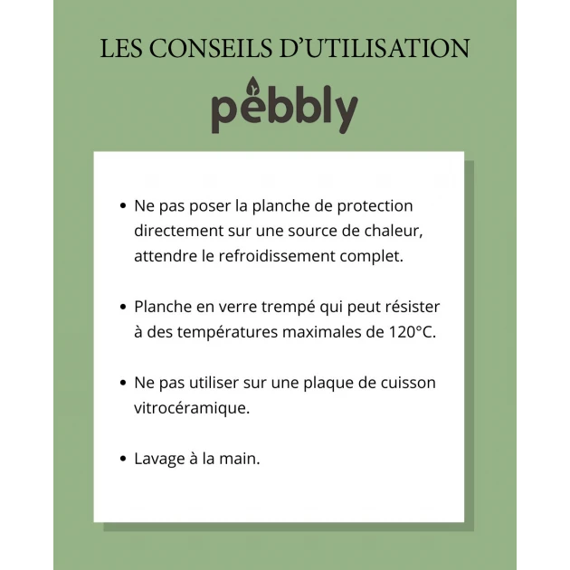 - Utilisations : protection des plaques de cuisson, repose-plat, planche à découper, plan de travail, service