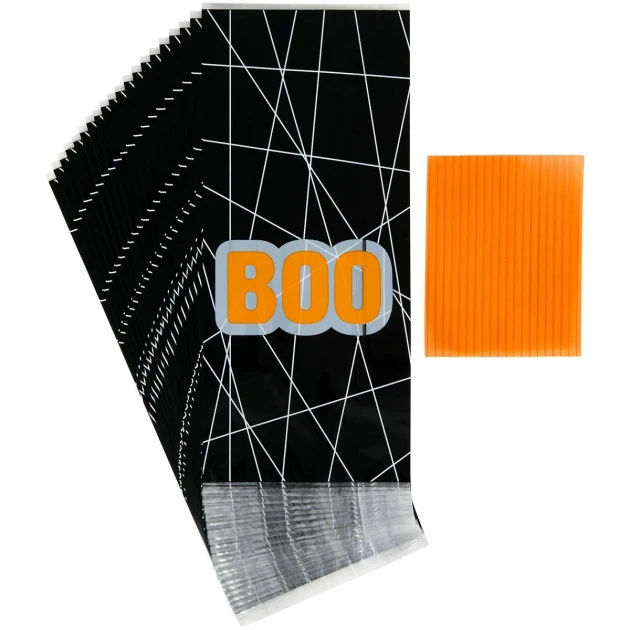 Sur un fond noir, découvrez le message « Boo » inscrit en grosses lettres orange. Remplissez chaque Sachet Bonbon « Boo » de confiseries, chamallows et autres gourmandises avant de les offrir aux vampires qui traverseront votre porte !