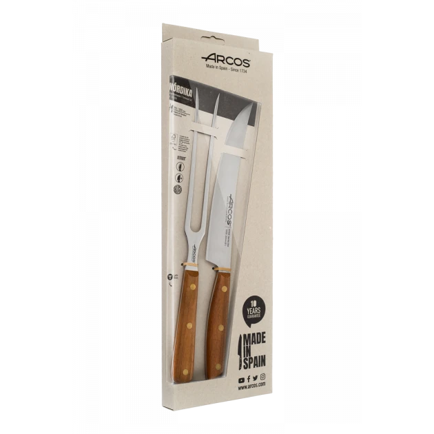 Fabriqué en inox Nitrum et doté d’un manche en bois Ovengkol 100% naturel issu de forêts certifiées FSC, ce Service Arcos est idéal pour découper vos viandes avec une précision unique. Ce coffret contient une fourchette (215 mm) possédant deux pointes allongées pour maintenir et piquer parfaitement vos viandes ainsi qu’un couteau à découper (200 mm) qui se caractérise par son tranchant spécial soie, une technique élaborée directement à Albacete en Espagne, avec le savoir-faire à la fois ancien et innovant des maîtres coupeur et qui vous permettra de découper en douceur.