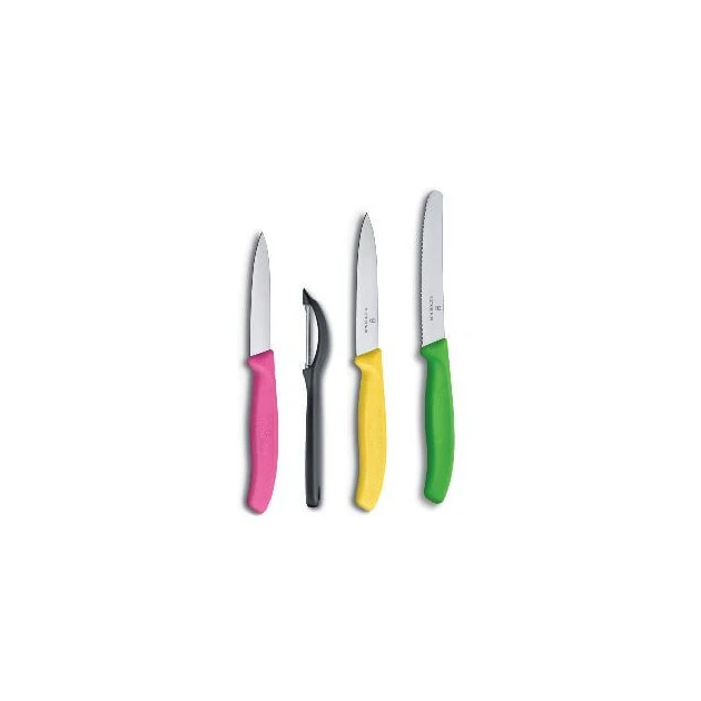 Complétez votre panoplie de couteaux par un set de qualité professionnelle. Que vous soyez amateur ou professionnel, le lot de couteaux d’office et épluche légumes Victorinox vous sera très utile. Ce set contient deux couteaux d’office à la lame lisse parfaits pour dénoyauter, détailler, ou égrainer fruits et légumes, un couteau de table avec une lame dentelée, et un épluche légumes avec une lame à double tranchant.