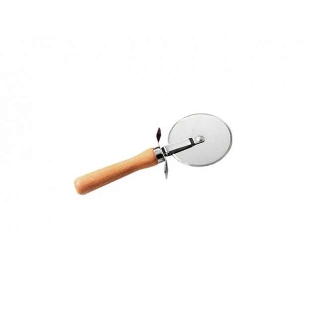 Le couteau à pizza avec son manche en bois, roule pour découper de belles parts parfaitement droites.