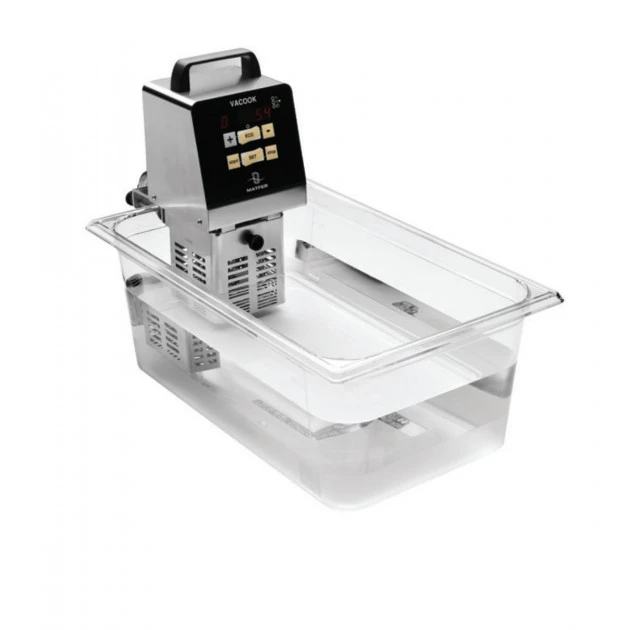 Le Thermo Plongeur VACOOK se compose d’une résistance et d’une turbine. L’eau va ainsi rapidement monter en température (jusqu’à 100°C) et va être brassée afin d’être à la même température sur l’ensemble du volume. L’appareil de cuisson sous vide professionnel VACOOK s’arrête automatiquement en cas de manque d’eau. Il peut s’adapter sur les bacs gastronorme jusqu’à 50 litres.Â